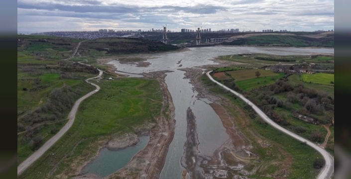 İstanbul'da Sazlıdere Barajı'ndaki su seviyesi, kentin kuraklık tehlikesiyle karşı karşıya olduğunu gösteriyor. Barajın doluluk oranı sadece yüzde 16,44 seviyesine düştü. Dronla çekilen görüntülerde, yüzlerce metrekare alanın tamamen kuruduğu ve toprağın derin çatlaklarla kaplandığı gözlemlendi.