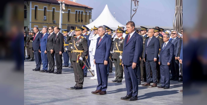 İzmir'deki kutlamalar, Cumhuriyet Meydanı'ndaki Atatürk Anıtı'na çelenk sunumu ile başladı. İzmir Valisi Süleyman Elban, İzmir Büyükşehir Belediye Başkanı Cemil Tugay, Ege Ordusu ve Garnizon Komutanı Orgeneral İrfan Özsert, milletvekilleri, siyasi parti temsilcileri, askeri ve idari erkan ile çok sayıda vatandaş törene katıldı. Saygı duruşu ve İstiklal Marşı'nın okunmasının ardından Cumhurbaşkanı Recep Tayyip Erdoğan'ın mesajı okundu.