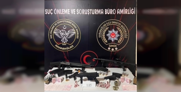 İzmir Karabağlar'da bir eve düzenlenen operasyonda Uzi, ruhsatsız tabanca, uyuşturucu haplar, esrar ve 63 bin TL nakit para ele geçirildi. Olayla ilgili 3 kişi gözaltına alındı.