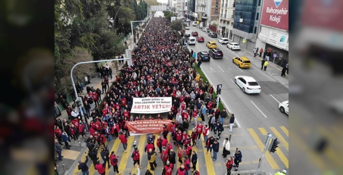İzmir Büyükşehir Belediyesi'ne bağlı şirketlerde çalışan işçiler, aylardır ödenmeyen hakları ve işten çıkarmalara tepki olarak çıplak ayakla protesto yürüyüşü düzenledi. DİSK Genel-İş Sendikası'na bağlı şubelerin öncülüğünde toplanan işçiler, sendika binasından Kültürpark'a kadar ayakkabılarını çıkararak yürüdü. Eylem sırasında 'Hakkımız olanı istiyoruz' ve 'Baskılar bizi yıldıramaz' gibi sloganlar atıldı.