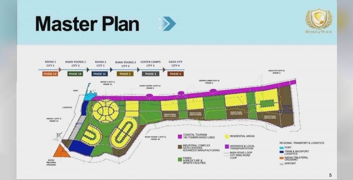 Kushner, 'Yeni Gazze' olarak adlandırdığı ana plan kapsamında, Refah şehrinde 100 bin yeni konutun yanı sıra yüksek binaların inşasını da içerdiğini belirtti. Renk kodlu bir harita üzerinden konut geliştirme, veri merkezleri ve sanayi parkları için ayrılmış alanları detaylandırdı. Altı aşamalı bir kalkınma takvimine dayanan çalışmaların, güneyden başlayıp kuzeye doğru ilerlemesi planlanıyor, ilk aşamalar Refah ve Han Yunus'a odaklanıyor.