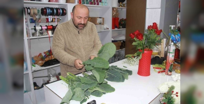 Ordulu çiçekçi Mevlüt Kuvan, gül buketlerinde karalahana kullanarak hem estetik hem de lezzet sunmayı başarıyor.Karadenizli çiçekçi, gül buketini karalahana ile süslüyor