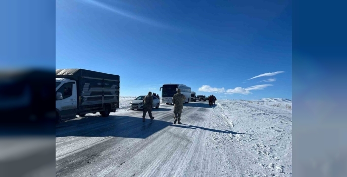 Kars'ta eksi 30 derecede buz pistine dönen yolda yüzlerce araç mahsur kaldı, bebekler soğukta bekliyor
