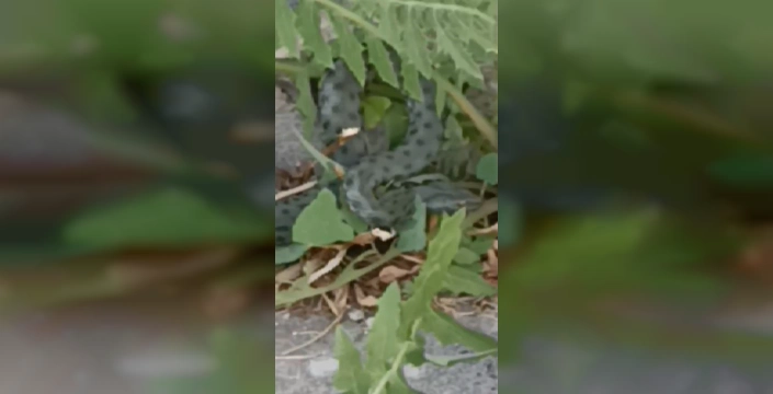Öğle saatlerinde kaldırımda sürünen, yaklaşık 1 metre uzunluğundaki yeşil yılanı gören vatandaşlar, çevredekileri uyardı. Belediye temizlik personeli yılanı cep telefonu ile kaydetti. Yılan, bir süre kaldırımda kaldıktan sonra otların arasına girdi.