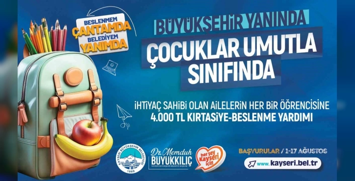 Kayseri Büyükşehir Belediyesi, 2025-2026 eğitim öğretim yılında ihtiyaç sahibi ailelerin çocuklarına 4 bin TL’lik kırtasiye ve beslenme desteği sağlayacak; başvurular 1 Ağustos-17 Ağustos tarihleri arasında online olarak kabul edilecek.