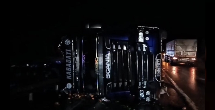 Kütahya-Eskişehir karayolunda sağanak yağış nedeniyle meyve yüklü bir tır devrildi. Sürücü yara almadı, yol bir süre trafiğe kapatıldı.