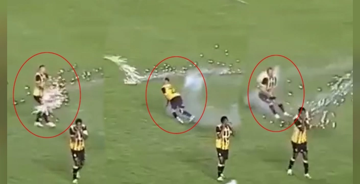 Bolivya Ligi'nde Blooming ile Strongest arasında oynanan maçta, Blooming taraftarlarının attığı havai fişeklerden biri Strongest oyuncusu Juan Godoy'a isabet etti.