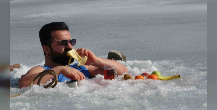 Doğu Anadolu’nun sert kış koşullarında dikkat çeken bir manzara sergileyen Türken, suya girmeden önce barajın bendindeki kaya parçalarına kalın ip bağlayarak güvenliğini sağladı. Baltayla buzu kırdıktan sonra suya girip yanında getirdiği termosla çay içti. Bu sırada meyve de yiyerek hem sağlıklı yaşama vurgu yaptı hem de kış turizmi için ilginç bir etkinlik gerçekleştirdi.