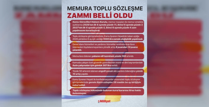 Kurul, kamu işvereninin bu teklifini kabul etti. 2026 yılı birinci 6 ayında verilen bin liralık taban aylık zammında değişiklik yapılmadı. Ancak, genel idare hizmetleri ve yardımcı hizmetler sınıfında olup ilave ödemeden faydalanmayanlara yönelik artış 8 puandan 10 puana çıkarıldı. Ayrıca, memurlara ödenen yabancı dil tazminatı yüzde 100, yüzde 50 artırımlı ödenen engelli çocuk aile yardımı ödeneği ise yüzde 10 artırıldı. Kamu İşveren Heyeti ile konfederasyonlar arasındaki görüşmelerde genele ilişkin uzlaşılan 58 madde de kabul edildi.