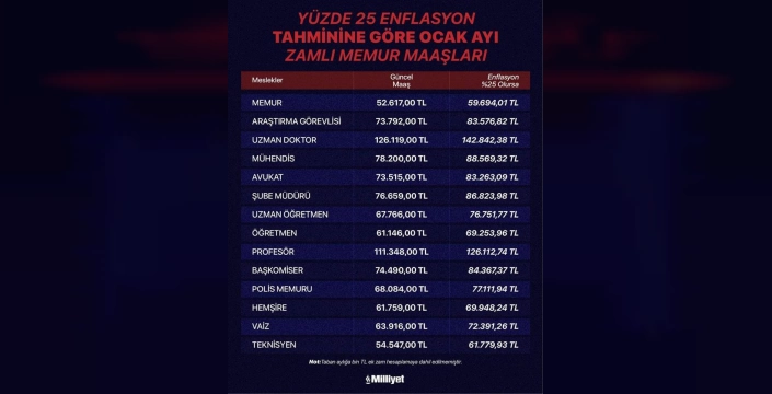Sosyal Güvenlik Müşaviri Emin Yılmaz, milliyet.com.tr'ye yaptığı açıklamada, Merkez Bankası'nın yıl sonu enflasyon tahmini olan %25-%29 aralığı ve toplu sözleşme zam oranlarını baz alarak ocak ayı maaşlarında %13,26 ile %16,88 arasında bir zam farkı olacağını belirtti. Yılmaz, en düşük bekar memur maaşının 52.903 TL ile 54.595 TL, en düşük evli memur maaşının 57.238 TL ile 59.068 TL ve en düşük memur emeklisi maaşının 25.674 TL ile 26.496 TL arasında olacağını tahmin etti. Bu hesaplamalarda 1000 TL'lik taban maaş artışı dikkate alınmamıştır.