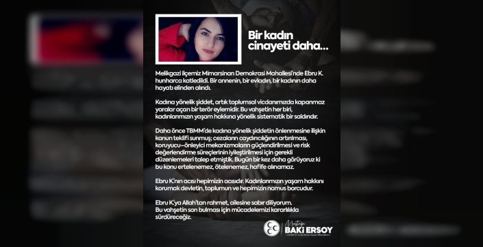 Ersoy açıklamasında, Melikgazi ilçesi Mimarsinan Demokrasi Mahallesi'nde Ebru K.'nın hunharca katledildiğini belirterek, bir annenin, bir evladın, bir kadının daha hayatının elinden alındığını vurguladı. Kadına yönelik şiddetin artık toplumsal vicdanda kapanmaz yaralar açan bir terör eylemi olduğunu ifade etti.