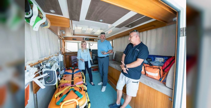 Akça, Bodrum Devlet Hastanesi ziyaretinin ardından Bodrum Deniz Kurtarma Derneği'ni ziyaret etti ve Bodrum Marina'da bulunan deniz ambulansını yerinde inceledi. Deniz Kurtarma Derneği yetkililerinden deniz ambulansının teknik donanımı ve kullanım kapasitesi hakkında detaylı bilgi alan Akça, 13 metre uzunluğa ve 3,65 metre genişliğe sahip olan ve uluslararası B-Offshore sertifikasına sahip olan ambulansın, Sağlık Bakanlığı standartlarına uygun olarak tasarlandığını öğrendi. Zorlu hava ve deniz şartlarında güvenli müdahale imkanı sunan ambulans, dikkat çekici bir sağlık yatırımı olarak değerlendiriliyor.