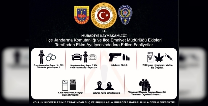 Muradiye Kaymakamlığı'ndan yapılan açıklamada, İlçe Jandarma Komutanlığı ve İlçe Emniyet Müdürlüğü ekiplerinin ekim ayı boyunca yürüttüğü denetim ve operasyonların bilançosu paylaşıldı. Bu kapsamda, toplam 101 bin 65 kişinin kimlik sorgusu yapılırken, çeşitli suçlardan aranan 5 kişi yakalandı. Trafik güvenliği de ön planda tutularak 7 bin 984 araç kontrol edildi ve 214 araca yasal işlem uygulandı.