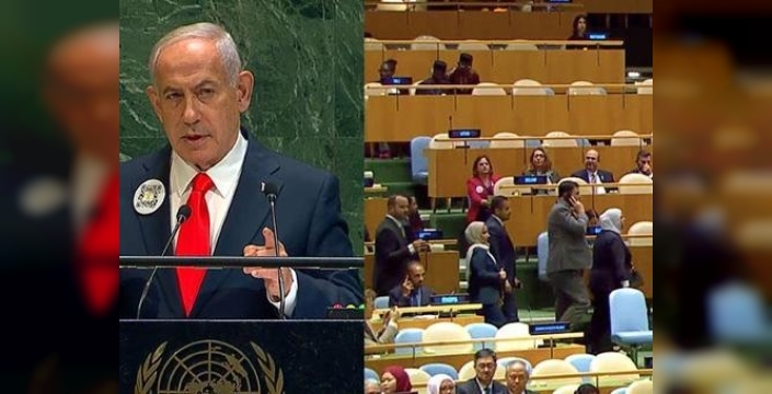İsrail Başbakanı Binyamin Netanyahu, Birleşmiş Milletler Genel Kurulu'nda konuşma yaptığı esnada salonda protesto gösterileri başladı. Protestocuların salonu terk etmesi üzerine Netanyahu, konuşmasını boşalan salona karşı sürdürmek durumunda kaldı.