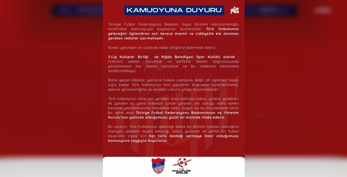Bahsi geçen iddiaların sadece hakem camiasını değil, Türk futbolunun tüm yapısını etkilediği belirtilerek, Niğde Belediyespor, TFF Başkanı İbrahim Hacıosmanoğlu ve yönetim kurulunun karanlık yapılanmalarla mücadelesini desteklediğini açıkladı. Kulüp, Türk futbolunun itibarının yeniden tesis edilmesi için gereken her türlü desteği vermeye hazır olduklarını ifade etti.