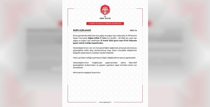 Niğde Valiliği tarafından yapılan açıklamada, 51-76 Kontrol Kesim Numaralı Niğde-Çiftlik İl Yolu’nun 8. kilometre ile 30. kilometre arasındaki kısmın, olumsuz hava koşulları nedeniyle 31 Aralık 2025 günü saat 07.45 itibarıyla araç trafiğine kapatıldığı belirtildi. Açıklamada, vatandaşların can ve mal güvenliğinin korunması amacıyla bu güzergahta trafik akışının durdurulduğu ifade edildi.