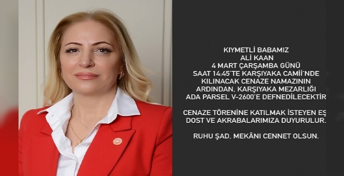 Merhum Ali Kaan’ın cenazesi, 4 Mart Çarşamba günü saat 14:45’te Karşıyaka Camii’nde kılınacak cenaze namazının ardından Karşıyaka Mezarlığı Ada Parsel V-2600’e defnedilecek.