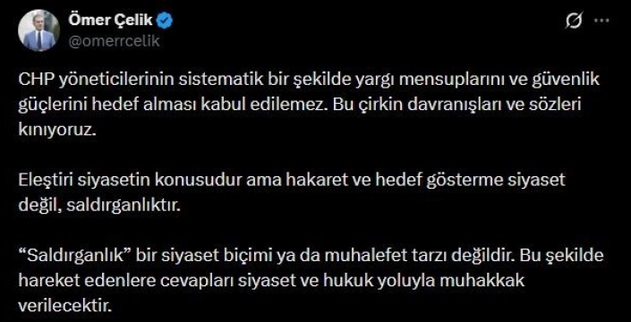 Sosyal medya hesabı üzerinden açıklamalarda bulunan Çelik, "CHP yöneticilerinin sistematik bir şekilde yargı mensuplarını ve güvenlik güçlerini hedef alması kabul edilemez. Bu çirkin davranışları ve sözleri kınıyoruz. Eleştiri siyasetin konusudur ama hakaret ve hedef gösterme siyaset değil, saldırganlıktır." ifadelerini kullandı.