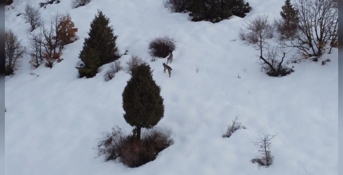 Ozan Türkmen, karlı arazide drone ile vaşak ailesini kaydetmeyi başardı. Refahiye ilçesi Kırkbulak köyü civarında nesli tükenme tehdidi altında olduğu için Dünya Doğa ve Doğal Kaynakları Koruma Birliği (IUCN) kırmızı listesinde yer alan bu hayvanlar, bir süre sonra gözden kayboldu.