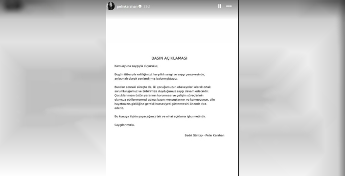 Oyuncu Pelin Karahan ve iş insanı Bedri Güntay, 12 yıllık evliliklerini karşılıklı sevgi ve saygı çerçevesinde anlaşmalı olarak sonlandırdı. Çift, çocuklarının üstün yararının korunması adına gizlilik talebinde bulundu.