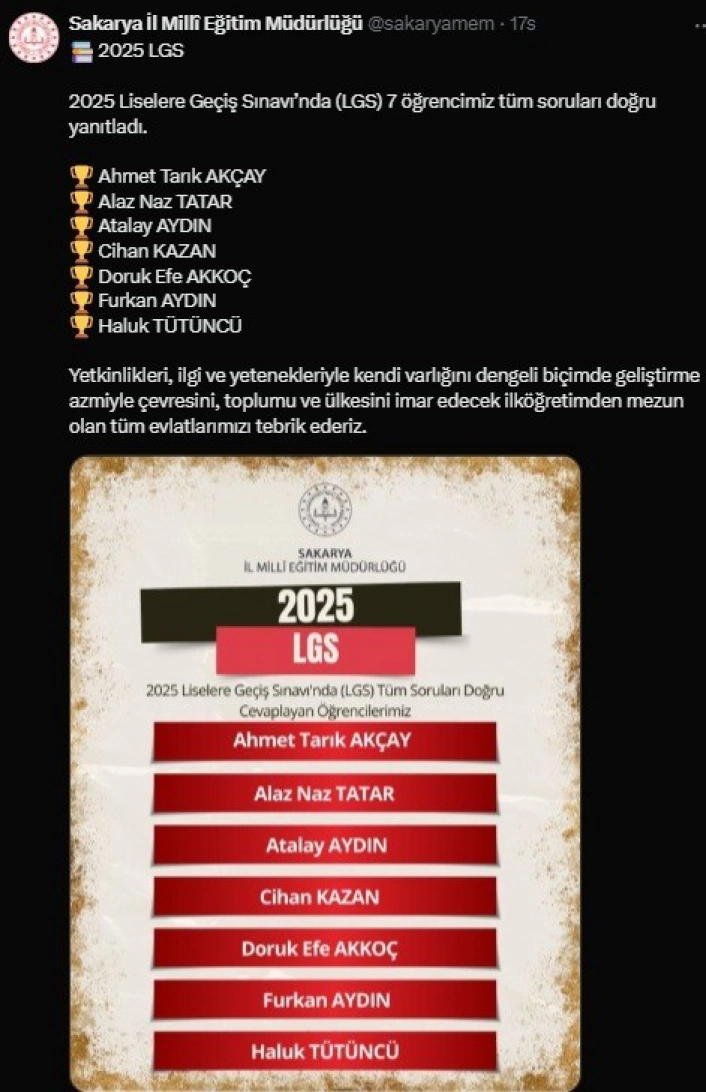 Milli Eğitim Bakanlığı, 15 Haziran tarihinde yapılan ve 8inci sınıf öğrencilerinin liselere girişini sağlayan Liselere Geçiş Sistemi (LGS) sonuçlarını açıkladı. Merkezi sınav sonuçlarına göre Türkiye genelinde 719 öğrenci, Sakarya genelinde ise 7 öğrenci tüm soruları doğru yanıtlayarak 500 tam puan aldı. Sakarya İl Milli Eğitim Müdürlüğünün sosyal medya hesabından, LGSde 500 tam puan alan öğrencileri için tebrik mesajı yayımlandı. Mesajda, "2025 Liselere Geçiş Sınavında (LGS) Ahmet Tarık Akçay, Alaz Naz Tatar, Atalay Aydın, Cihan Kazan, Doruk Efe Akkoç, Furkan Aydın ve Haluk Tütüncü isimli 7 öğrencimiz tüm soruları doğru yanıtladı. Yetkinlikleri, ilgi ve yetenekleriyle kendi varlığını dengeli biçimde geliştirme azmiyle çevresini, toplumu ve ülkesini imar edecek ilköğretimden mezun olan tüm evlatlarımızı tebrik ederiz" ifadeleri yer aldı.