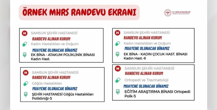 MHRS'de, 1 Aralık itibarıyla Eğitim ve Araştırma Ana Bina, Atakum Polikliniği, Kadın Doğum ve Çocuk Hastalıkları ile Onkoloji ek hizmet binalarının randevuları Samsun Şehir Hastanesi üzerinden alınıyor. Ancak randevu ekranının harita bölümünde, ek hizmet binaları için alınan randevularda bile konum olarak ana hastanenin gösterilmesi, vatandaşların Canik'teki yeni ana binaya gitmesine neden oluyor.