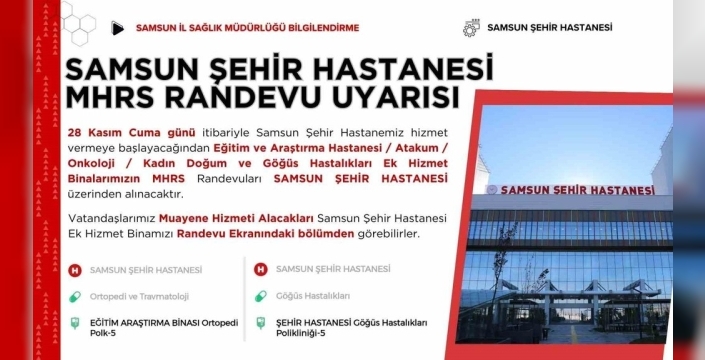Açıklamada, '28 Kasım Cuma günü itibariyle Samsun Şehir Hastanemiz Canik ilçemizdeki ana binasında öncelikle Göğüs Hastalıkları Kliniğimizle hizmet vermeye başlayacaktır. Bu tarih itibariyle Eğitim ve Araştırma Hastanesi / Atakum / Onkoloji / Kadın Doğum binalarımız Samsun Şehir Hastanemize bağlı olarak hizmet vermeye başlayacağından, MHRS Randevuları da Samsun Şehir Hastanemiz üzerinden alınacaktır.' ifadesine yer verildi.