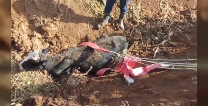 Şanlıurfa'nın Eyyübiye ilçesinde, tahliye kanalına düşerek çamura saplanan bir inek, itfaiye ekiplerinin müdahalesi sonucunda kurtarıldı. Olay, Uğurlu Mahallesi kırsalında ineğini otlatan bir vatandaşın hayvanının kanala düşmesiyle başladı.