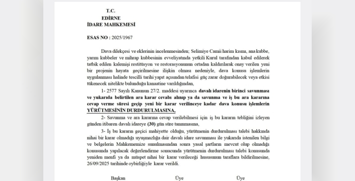 UNESCO Dünya Kültür Mirası Listesi'nde bulunan ve Mimar Sinan'ın 'ustalık eserim' olarak tanımladığı Selimiye Camii'nde, restorasyon çalışmaları kapsamında kubbe yazılarında yapılması planlanan değişikliğe Edirne İdare Mahkemesi'nden 'dur' kararı geldi. Mahkeme, söz konusu değişikliğin yürütmesinin durdurulmasına hükmetti.