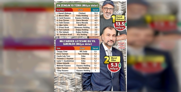 Türkiye'nin en zengin ismi, yıllar sonra ilk kez değişti. ABD merkezli Chobani markasının sahibi Hamdi Ulukaya, 13.5 milyar dolarlık servetiyle listenin zirvesine yerleşti. Bir yılda servetini 11.2 milyar dolar artıran Ulukaya, dünya sıralamasında 219'uncu sırada yer aldı. Listenin ikinci sırasında 5.3 milyar dolarlık servetiyle Murat Ülker, üçüncü sırada ise 4.9 milyar dolara yükselen Şaban Cemil Kazancı bulunuyor. ABD merkezli Sierra Nevada şirketinin kurucu ortaklarından Eren Özmen 4.9 milyar dolarlık servetiyle dördüncü, Fatih Özmen ise 4.7 milyar dolarlık servetiyle beşinci sırada yer alıyor. Bu yılki listede ayrıca, BioNTech'ten ayrılacağını açıklayan Uğur Şahin de 4.7 milyar dolarlık servetiyle beşinci sırayı paylaşıyor. Selçuk Bayraktar 2.7 milyar dolarlık servetiyle 13'üncü, Haluk Bayraktar ise 2.4 milyar dolarlık servetiyle 16'ncı sırada bulunuyor. Son bir yılda Hüsnü Özyeğin, Ahmet Çalık ve Mehmet Ali Aydınlar gibi isimlerin de servetlerinde önemli artışlar kaydedildi.