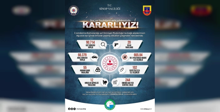 Sinop Valiliği, İl Emniyet Müdürlüğü ve İl Jandarma Komutanlığı, ağustos ayına ait güvenlik ve denetim faaliyetlerinin sonuçlarını kamuoyu ile paylaştı. İl Emniyet Müdürlüğü ve İl Jandarma Komutanlığı'nın suç ve suçlularla mücadelesi kararlılıkla devam ediyor.