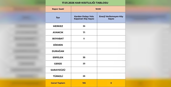17 Ocak saat 10.00 itibarıyla ilçe dağılımına bakıldığında, en fazla kapanmanın Ayancık'ta yaşandığı görüldü. Ayancık'ta 71 köy yolu kar nedeniyle ulaşıma kapanırken, Merkez ilçede 35, Erfelek'te 35, Türkeli'nde 26, Gerze'de 23 ve Boyabat'ta 5 köy yolu kapalı bulunuyor. Diğer ilçelerde ise yol kapanmalarının sınırlı olduğu bildirildi.