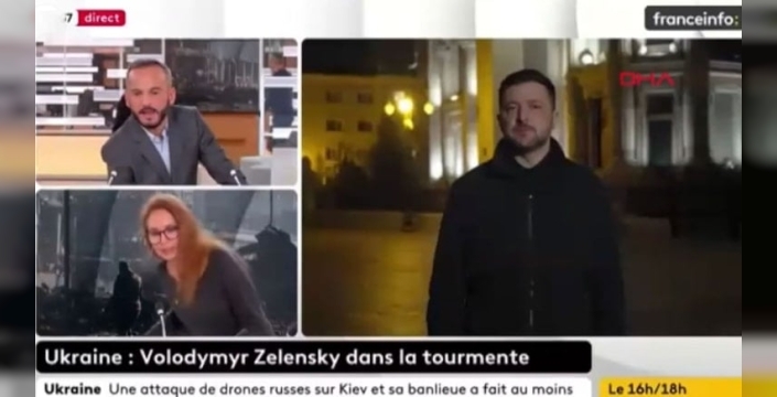 Ukrayna Devlet Başkanı Volodimir Zelenski'nin katıldığı bir canlı yayın, siren sesleriyle kesintiye uğradı. Sirenlerin yükselmesi üzerine program ekibi binayı tahliye ederken, Zelenski stüdyoda kalmayı tercih etti. Kameralar, stüdyonun tahliye edildiği anları saniye saniye kaydetti.