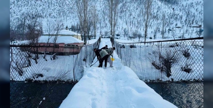 Şırnak'ın Beytüşşebap ilçesinde 1974 yılında inşa edilen tahta asma köprü, köylülerin özenli bakımı sayesinde yıllara meydan okuyor. Kış aylarında kar kalınlığının 2 metreyi bulduğu bölgede, köprünün ağırlıktan kırılma riskine karşı köy sakinleri nöbet tutarak temizlik çalışmaları başlatıyor.