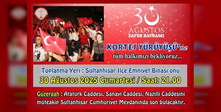 Saat 20.00'da başlayacak kortej için Belediye Başkanı Osman Yıldırımkaya, '30 Ağustos Zaferi için tüm halkımızı kortejimize bekliyoruz' açıklamasını yaptı. Aydın genelinde olduğu gibi Sultanhisar'da da bayram coşkusu yaşanacak.
