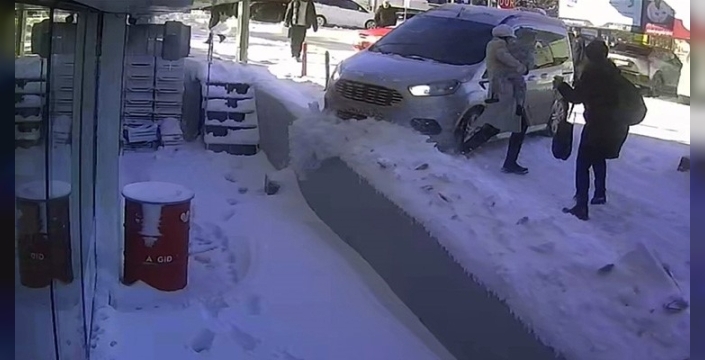 Olay, ilçenin Kültür Mahallesi'nde bulunan Adalet Plaza önünde meydana geldi. Buzlanma nedeniyle kayan araç, yolda çocukla birlikte yürüyen iki kadına doğru savruldu. Neyse ki, kadın ve kucağındaki bebek, son anda araç altında kalmaktan kurtuldu.