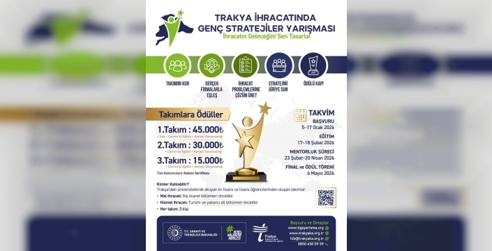 Trakya Kalkınma Ajansı, bölge üniversitelerindeki öğrenciler için ihracat stratejisi yarışması düzenliyor. Kazanan takımlara 45 bin TL'ye varan para ödülleri ve kariyer desteği verilecek.