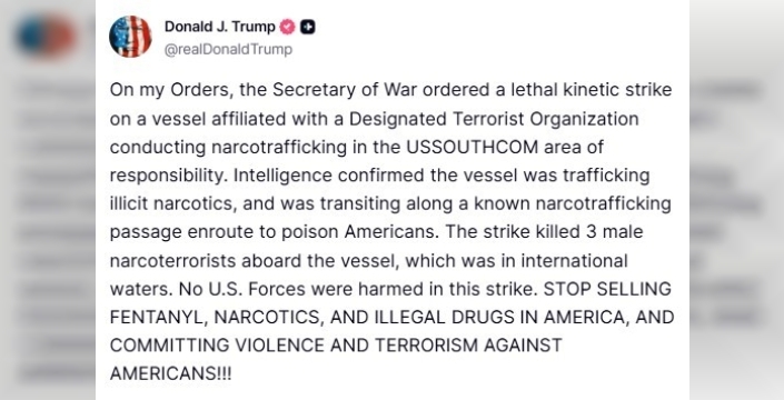 Trump, saldırıda uluslararası sularda seyreden teknedeki üç erkek narko-teröristin öldürüldüğünü ve hiçbir ABD personelinin zarar görmediğini vurguladı. Açıklamasının sonunda ise "Amerika’da Fentanil, uyuşturucu ve yasadışı ilaç satışını durdurun ve Amerikalılara yönelik şiddet ve terörizme son verin!" uyarısında bulundu. Bu saldırı, ABD'nin son zamanlarda uyuşturucu taşıyan tekneleri hedef alan üçüncü saldırı olarak kayıtlara geçti.