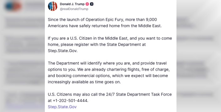 Trump, sosyal medya hesabı üzerinden yaptığı açıklamada, bölgeden ayrılmak isteyen ABD vatandaşlarını ABD Dışişleri Bakanlığı'nın "Step.State.Gov" adresi üzerinden kayıt olmaya çağırdı. Bu kayıtların, bakanlığın vatandaşların nerede olduğunu belirlemesine ve seyahat seçenekleri sunmasına olanak sağlayacağını belirtti. Ücretsiz uçuşlar ve ticari seçenekler için rezervasyonların yapıldığını ve bu imkanların zamanla artmasının beklendiğini ifade etti.