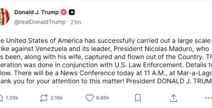 Trump'ın paylaşımına göre, ABD kolluk kuvvetlerinin iş birliğiyle gerçekleştirilen bu geniş çaplı operasyon, Venezuela liderini ve eşini hedef aldı. Operasyonun detaylarının ilerleyen saatlerde paylaşılacağı ifade edildi.