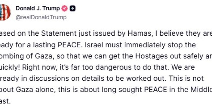 ABD Başkanı Donald Trump, Hamas'ın kalıcı bir barışa hazır olduğuna inandığını belirterek, İsrail'in Gazze'yi bombalamayı derhal durdurması gerektiğini ifade etti.