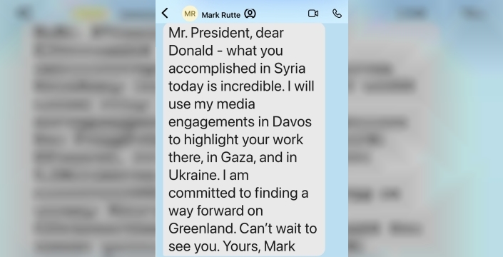 Emmanuel Macron, Trump'a gönderdiği mesajda, Suriye ve İran konularında aynı fikirde olduklarını belirterek, "Grönland konusunda ne yaptığını anlamıyorum. Harika şeyler yapmaya çalışalım." ifadesini kullanmıştı. Macron ayrıca, Perşembe öğleden sonra Paris'te bir G7 toplantısı düzenleyebileceğini ve Ukraynalıları, Danimarkalıları, Suriyelileri ve Rusları davet edebileceğini belirtmişti. Mark Rutte ise Trump'a yönelik mesajında, "Sayın Başkan, sevgili Donald, bugün Suriye’de başardığınız şey inanılmaz." diyerek, Gazze ve Ukrayna'daki çalışmaları öne çıkaracağını söylemişti. Rutte ayrıca, Grönland konusunda bir çözüm yolu bulmaya kararlı olduğunu ve Trump ile görüşmek için sabırsızlandığını dile getirmişti.