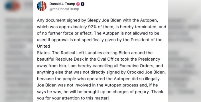 Donald Trump, kendi sosyal medya platformu Truth üzerinden yaptığı açıklamada, Joe Biden döneminde imzalanan resmi belgelerin yaklaşık yüzde 92'sinde gerçek imza yerine "Autopen" adı verilen bir imza makinesinin kullanıldığını öne sürdü. Trump, bu durumun Biden'ın imzasının taklit edildiği anlamına geldiğini ve başkanın özel izni olmadan "Autopen" kullanımının yasak olduğunu vurguladı.