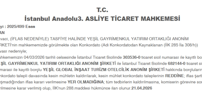 İstanbul Anadolu 3. Asliye Ticaret Mahkemesi, Yeşil Gayrimenkul ve Yeşil Global İnşaat'ın konkordato taleplerini reddetti. İflas durumu olmadığı tespit edildi.