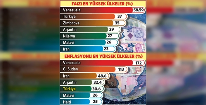 Türkiye, faiz oranlarında %37 ile dünyada Venezuela’nın ardından ikinci sırada yer alıyor. Enflasyon oranında ise %30,65 ile beşinci sırayı almış durumda. Bu sıralamada Türkiye’nin önünde, Venezuela, Güney Sudan, İran ve Arjantin bulunuyor. Özellikle Venezuela’da yıllık enflasyon %172, faiz oranı ise %58,59 düzeyinde seyrediyor.