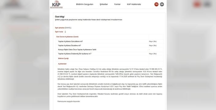Yapılan resmi açıklamaya göre, CarrefourSA'nın hakim ortağı Hacı Ömer Sabancı Holding A.Ş.'nin elindeki sermayenin yüzde 57,12'sine karşılık gelen payları ile diğer ana hissedar Carrefour Nederland BV.'nin sahip olduğu yüzde 32,16 oranındaki payların tamamı, Yeni Mağazacılık A.Ş.'ye devredilecek. Bu devir anlaşması kapsamında, 17 Nisan 2026 tarihinde taraflar arasında bir Pay Devir Sözleşmesi imzalandığı duyuruldu. Bu işlemle birlikte, toplamda şirket sermayesinin yüzde 89,28'ine denk gelen devasa bir pay el değiştirmiş olacak.