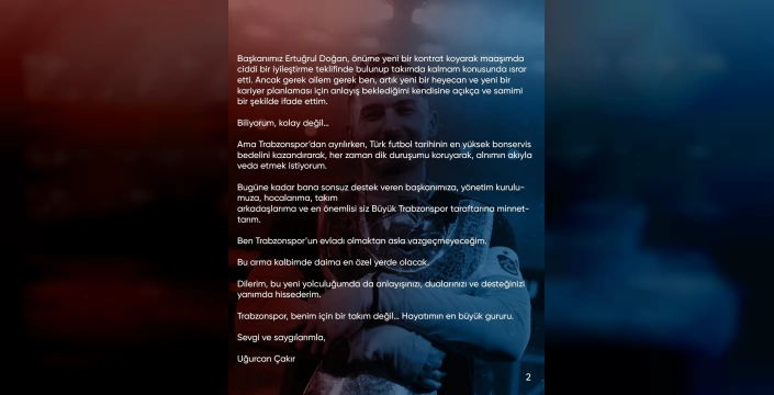 Çakır, açıklamasında şu ifadeleri kullandı: 'Bugün bu satırları yazmak benim için hiç kolay değil. Yıllarımı, emeğimi, hayallerimi verdiğim, çocukluk aşkım, yuvam Trabzonspor’a dair belki de en zor açıklamayı yapmak zorundayım. Bu şehrin sokaklarında büyüdüm, bu armaya gönül verdim. Bu asil formayı sırtıma her geçirdiğimde, her maçta, her anda Trabzonspor’un şanlı tarihine bir tuğla daha koymanın gururunu yaşadım. Kupalar kaldırdık, şampiyonluklar yaşadık, birlikte ağladık, birlikte güldük. Sizlerle kurduğumuz bağ, kelimelerle anlatılamayacak kadar özel. Ancak hayat bazen insanı zor kararlarla sınar. Benim için de böyle bir dönemden geçiyoruz. Şampiyonlar Ligi’nde forma giymek, ailemle birlikte yeni bir serüvene adım atmak ve futbol kariyerimde yeni hedeflere yürümek istiyorum. Bunun için Galatasaray’dan gelen teklifi değerlendirme kararı aldım.'