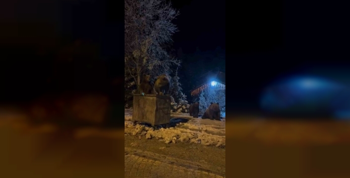 Bursa Uludağ'da yerleşim alanlarına inen bir anne ayı ve üç yavrusu, çöp konteynerlerinin üzerinde dolaşarak yiyecek aradı. Kar yağmasına rağmen hala kış uykusuna yatmamış olmaları, bölge sakinlerinin dikkatini çekti.