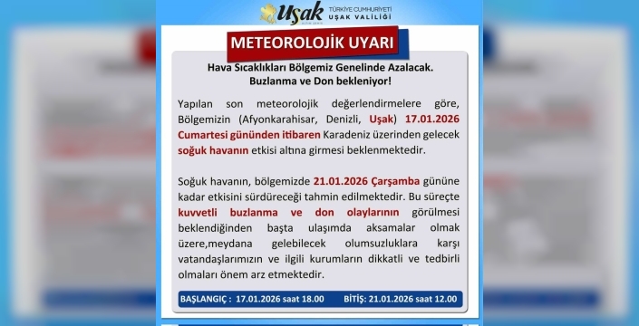 Uşak Valiliği, 17 Ocak Cumartesi gününden itibaren etkili olması beklenen soğuk hava dalgası nedeniyle buzlanma ve don olaylarına karşı vatandaşları ve ilgili kurumları uyardı.