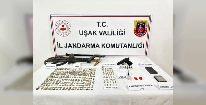 Uşak İl Jandarma Komutanlığına bağlı ekipler, tarihi eser kaçakçılığı ve uyuşturucu madde ticaretiyle mücadele kapsamında önemli bir operasyona imza attı. Yürütülen başarılı çalışmalar neticesinde, şüpheli şahısların evlerinde yapılan aramalarda çok sayıda tarihi obje ve sikkenin yanı sıra uyuşturucu madde de ele geçirildi.